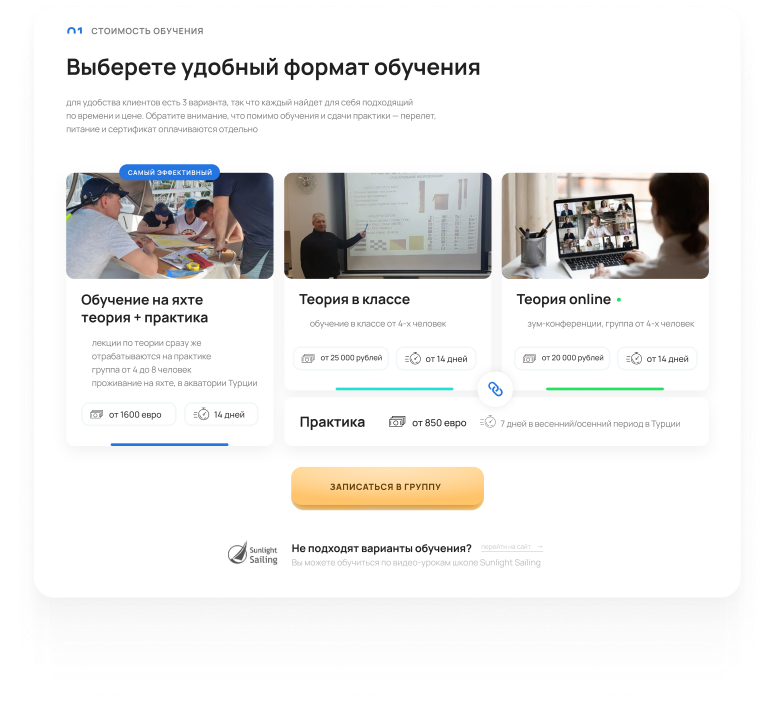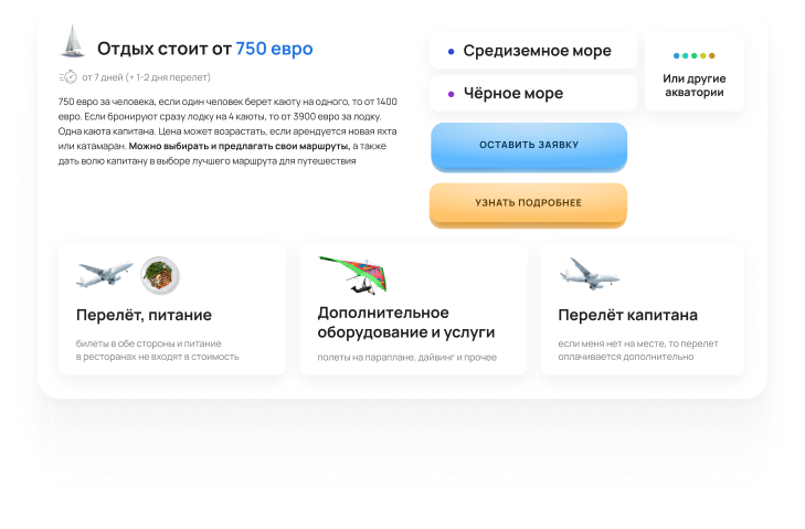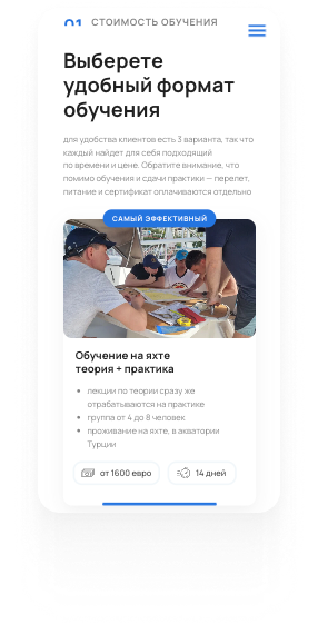 Сайт решает несколько задач: продает услуги по обучению вождения яхт и отдельно предлагает отправиться в круиз. Под каждую задачу разработаны свои разделы с детальной информацией.